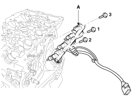 Установите форсунку и модуль топливораспределительной рампы (А).