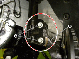 Снимите тормозной шланг (А) и датчик скорости вращения колеса (В).