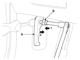 Используя торцевую головку (В), снимите ручку открывания капота (А).
