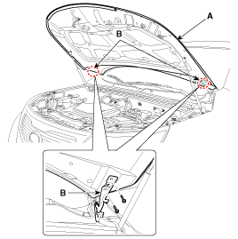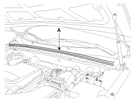 Отсоедините зажимы, затем снимите уплотнитель капота (А).