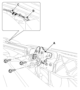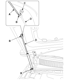 Отсоедините трос замка капота (В) и трос отпирания (С).