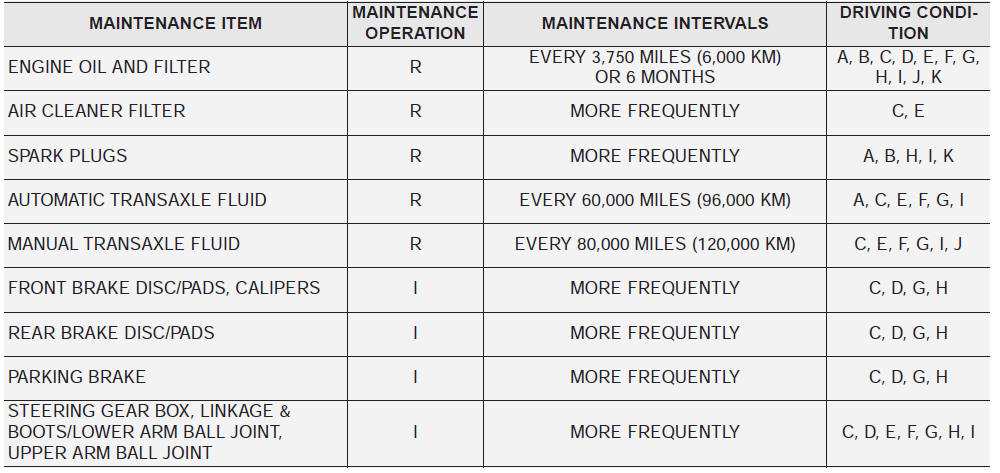 Следующие пункты должны обслуживаться чаще на автомобилях, обычно эксплуатируемых под тяжелые условия вождения. См. таблицу ниже для соответствующего технического обслуживания. интервалы.