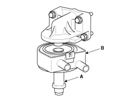 Ослабьте крепежный болт (А) и снимите узел масляного радиатора (В).