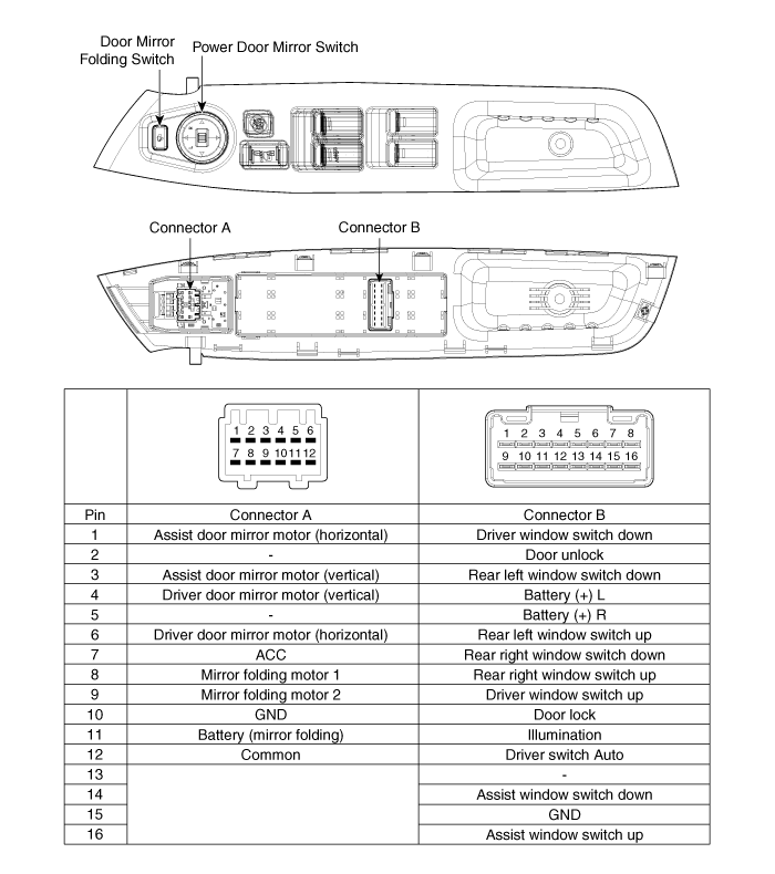 Kia Sorento: электрическая схема переключателя зеркал заднего вида с электроприводом