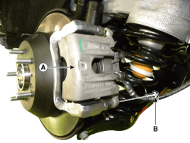 Ослабьте болт направляющей штанги (В) и поверните суппорт (А) вверх.