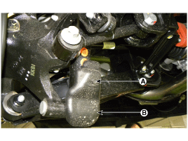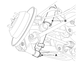 Ослабьте болт (А) и гайку (В), затем снимите задний амортизатор.