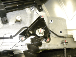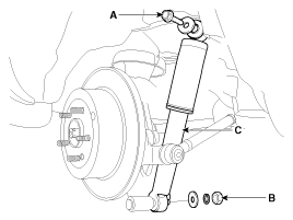 Ослабьте болт (A,B) и гайку (C), затем снимите задний амортизатор.