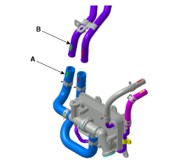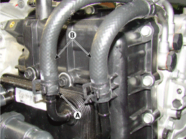 Отсоедините шланг охлаждающей жидкости (B) после снятия шланга охлаждающей жидкости.