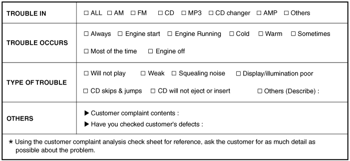 Kia Sorento: устранение неполадок, контрольный лист анализа жалоб клиентов
