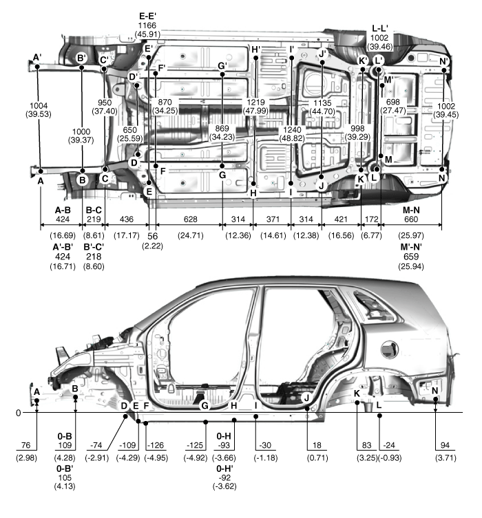 XM второго поколения (2011-2023 гг.) / Kia Sorento XM 2011-2023 Руководство по ремонту / Кузов (внутри и снаружи) / Размеры корпуса / Под кузовом (2WD)