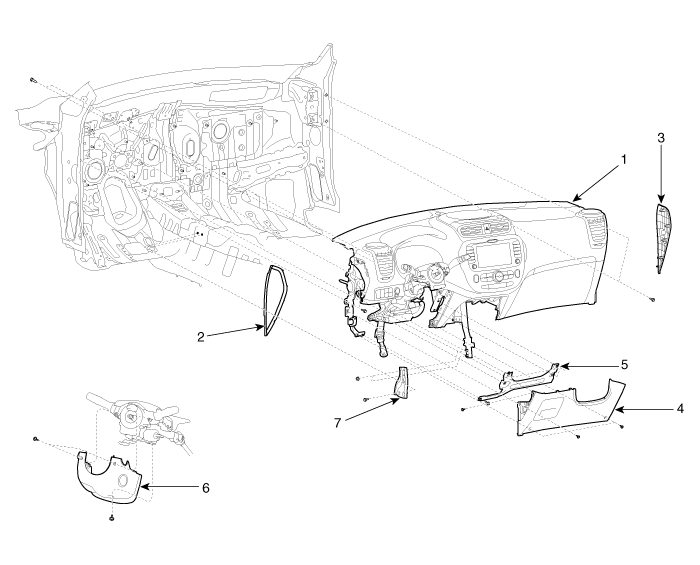 6. Нижняя панель кожуха рулевой колонки 7. Кронштейн для крепления к полу центральной опоры |