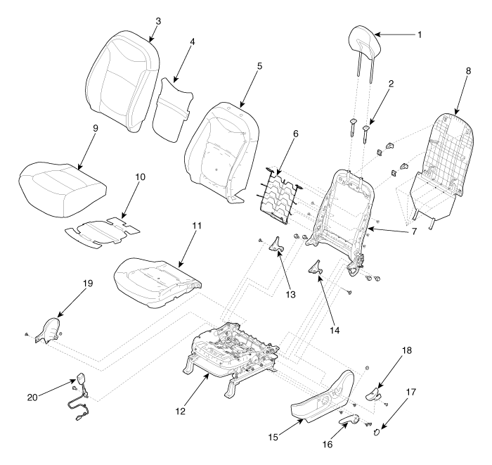 9. Чехол подушки переднего сиденья 10. Подогрев подушки переднего сиденья. 11. Подушка подушки переднего сиденья 12. Каркас подушки переднего сиденья в сборе 13. Внутренняя крышка переднего сиденья [RH] 14. Внутренняя крышка переднего сиденья [LH] |