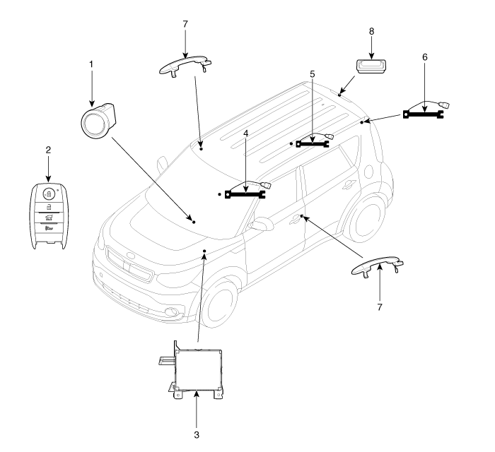 6. Бамперная антенна 7. Дверная ручка и дверная антенна 8. Переключатель открытия задней двери |