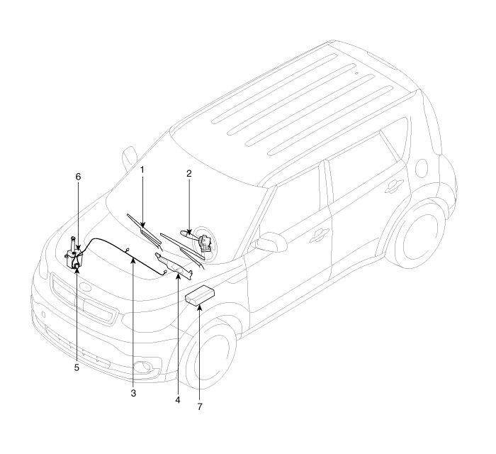 2. Переключатель стеклоочистителя и омывателя 3. Шланг омывателя ветрового стекла 4. Двигатель стеклоочистителя и рычажный механизм |