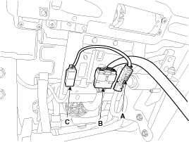 Отсоедините разъем подушки безопасности (А), разъем обогревателя сиденья и разъем переключателя сиденья с электроприводом (В) и разъем замка переднего ремня безопасности (С).