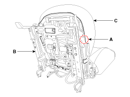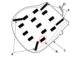 Вытяните крючки (А) и чехол подушки переднего сиденья (С) из рамы подушки переднего сиденья (В).