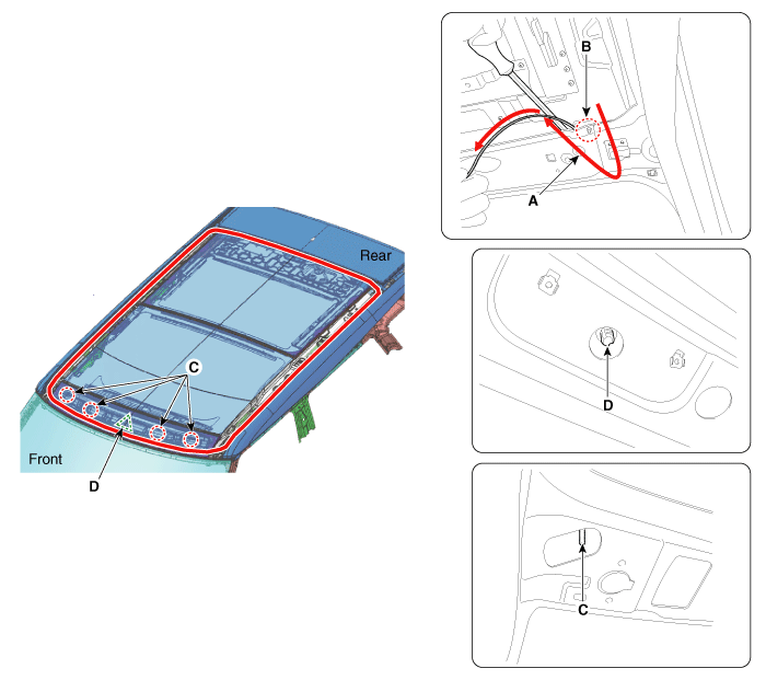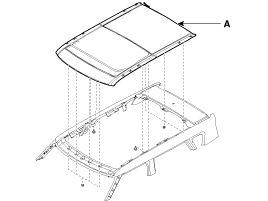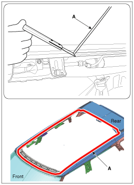 Срежьте остатки герметика на каждой поверхности и снимите панорамный люк в сборе (А).