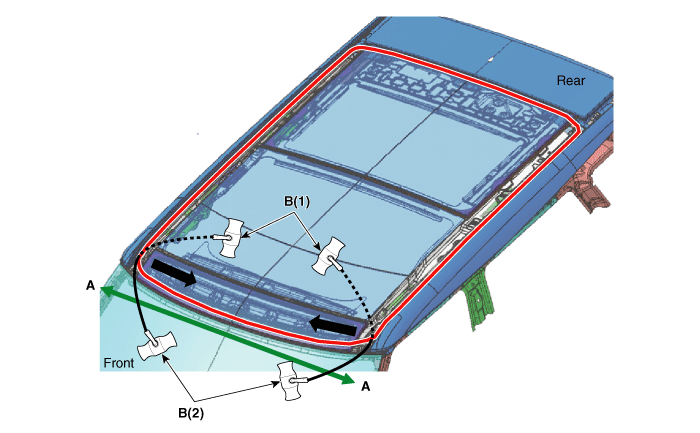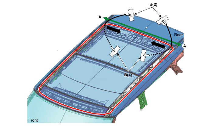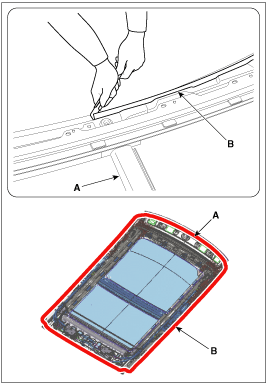 Если панорамный люк в сборе (А) используется повторно, используйте лезвие, чтобы удалить остатки герметика (В) вокруг панели кузова.