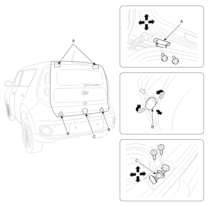 Отрегулируйте высоту задней двери, повернув запирающие бамперы задней двери (B).