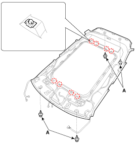 Используя съемник зажимов, отсоедините монтажные зажимы узла обивки крыши (А).