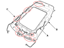 Снимите жгут проводов обшивки крыши (А) с узла обивки крыши (В).