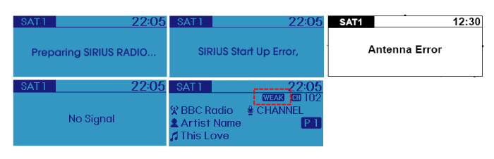 Ошибка антенны, ошибка запуска SIRIUS: проверьте подключение разъема антенны SIRIUS.