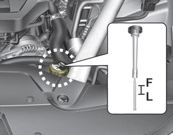 Уровень охлаждающей жидкости должен быть заполнен между отметками F и L на уровне охлаждающей жидкости. манометр, когда двигатель холодный.