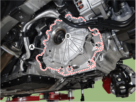 Ослабьте болты переднего дифференциала (В) и снимите передний дифференциал. (А).