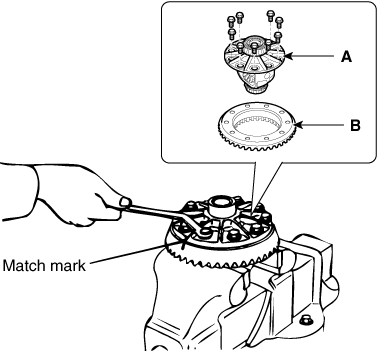 Ослабьте болты и снимите картер дифференциала (А) и зубчатый венец. (Б).