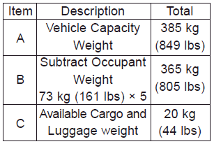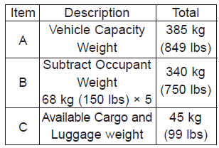 5. Определить общий вес багажа и груза, загружаемого в транспортное средство. Этот вес не может безопасно превышать доступную грузоподъемность груза и багажа. рассчитывается на шаге 4.