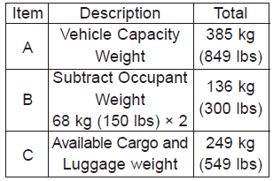 Конкретную информацию см. на табличке с информацией о шинах и загрузке вашего автомобиля. о грузоподъемности вашего автомобиля и местах для сидения. Общий вес водителя, пассажиров и груза никогда не должны превышать грузоподъемность вашего автомобиля масса.