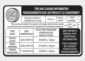 На наклейке, расположенной на пороге двери водителя, указан исходный размер шин в холодном состоянии. давление в шинах, рекомендуемое для вашего автомобиля, количество людей, которые могут находиться в ваш автомобиль и грузоподъемность автомобиля.