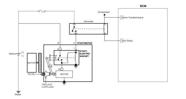 Пусковая система состоит из аккумулятора, стартера, магнето, зажигания и выключателя блокировки. (A/T), переключатель педали сцепления (M/T), переключатель ключа зажигания, соединительные кабели и кабель аккумулятора.