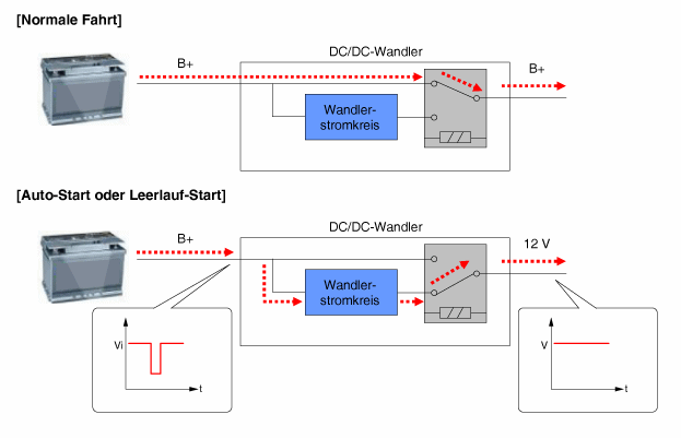 В режиме байпаса напряжение бортовой сети не подается преобразователем DC/DC, но передается непосредственно на выходы. В фазе усилителя напряжение автомобиля скорректировано.
