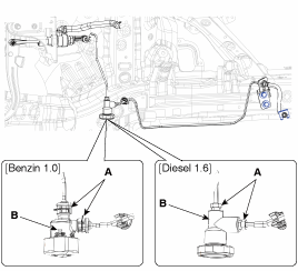 Nach dem Einbau und Einfüllen der Bremsflüssigkeit Entlüftungsverfahren im Kupplungsausrückzylinder durchführen. [Бензин 1,0 Т-ГДИ] (Siehe Kupplungsausrückzylinder - "Einstellung") [Дизель 1,6] (Siehe Konzentrischer Nehmerzylinder - "Einstellung") |