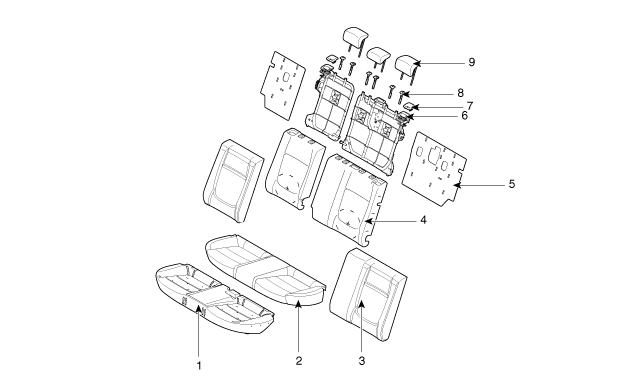 2. Rücksitzpolsterbezug 3. Rücksitzlehnenbezug 4. Rücksitzlehnenunterlage 5. Рюкзитцлененплатте |