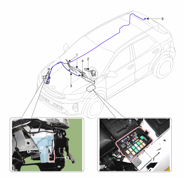 6. Waschflussigkeitsbehälter 7. Вишер-/Вашанлагенреле 8. Heckscheibenwaschanlagenschlauch und -düse |