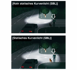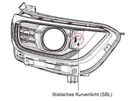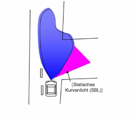 Das statische Kurvenlicht (links/rechts) wird basierend auf der Fahrzeuggeschwindigkeit und dem Lenkradeinschlagwinkel ein-/ausgeschaltet.