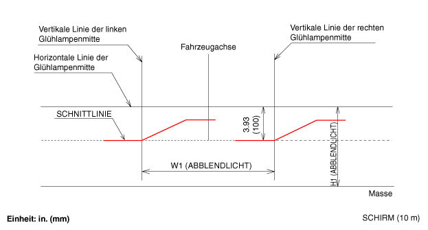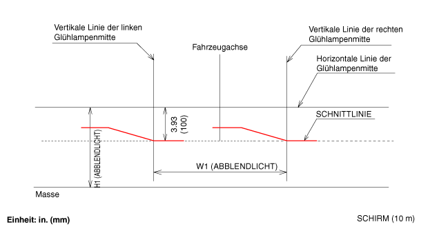 Scheinwerfer so einstellen, dass der hellste Bereich auf dem Schnittpunkt der vertikalen und horizontalen Linien Liegt. Auf den ordnungsgemäßen Zustand der Fahrzeugbatterie und der Scheinwerfer achten.