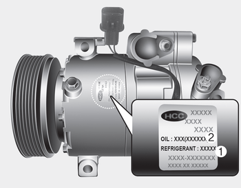 Этикетка компрессора информирует вас о типе компрессора, которым оснащен ваш автомобиль с такими как модель, номер детали поставщика, заводской номер, хладагент (1) и охлаждающее масло (2).