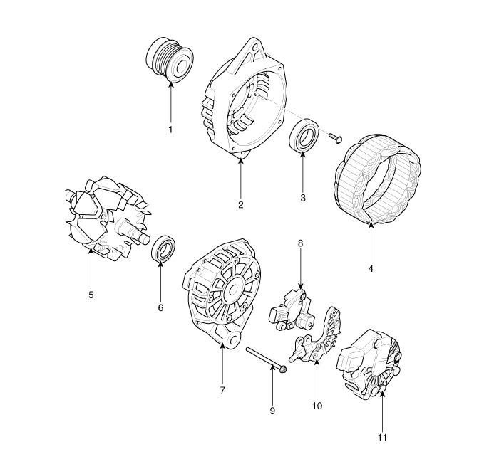 8. Сборка держателя щетки 9. Сквозной болт 10. Выпрямитель в сборе 11. Задняя крышка |