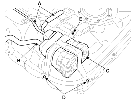 Снимите канистру (C), отвернув крепежные болты (D) и гайку (E).