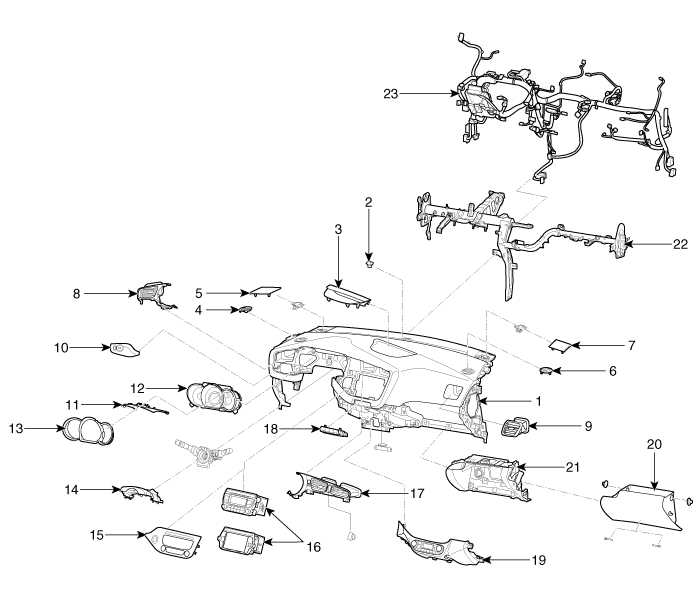 14. Верхняя панель кожуха рулевой колонки 15. Центральная панель 16. Аудио сборка 17. Центральный воздуховод 18. Центральный переключатель 19. Центральная нижняя панель аварийной площадки 20. Перчаточный ящик 21. Корпус перчаточного ящика 22. Перекладина капота в сборе 23. Основной жгут проводов аварийной площадки |