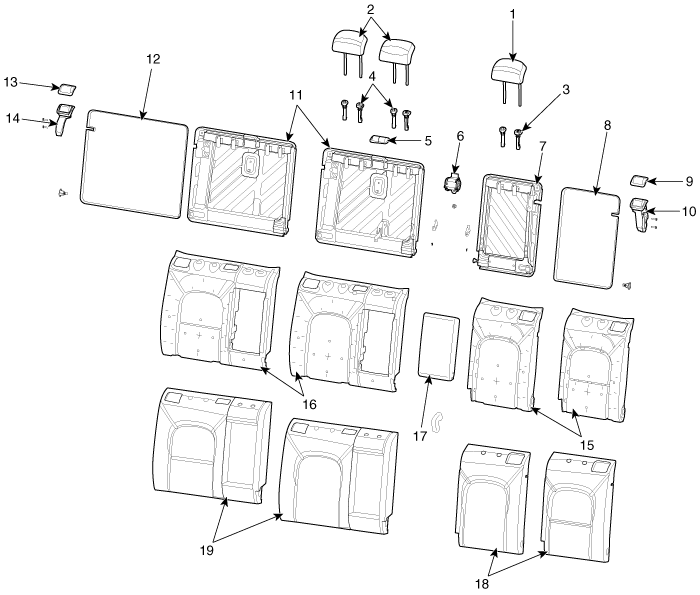 12. Ковровое покрытие спинки заднего сиденья [RH] 13. Крышка замка заднего сиденья [RH] 14. Защелка заднего сиденья в сборе [RH] 15. Подушка спинки заднего сиденья [LH] 16. Подушка спинки заднего сиденья [RH] 17. Подлокотник заднего сиденья в сборе 18. Обивка спинки заднего сиденья [LH] 19. Обивка спинки заднего сиденья [RH] |