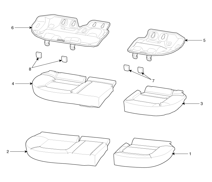 6. Каркас подушки заднего сиденья [RH] 7. Крышка крепления подушки заднего сиденья [LH] 8. Крышка крепления подушки заднего сиденья [RH] |