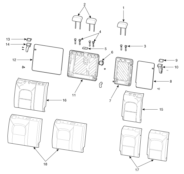 11. Структура спинки заднего сиденья [RH] 12. Ковровое покрытие спинки заднего сиденья [RH] 13. Крышка замка заднего сиденья [RH] 14. Защелка заднего сиденья в сборе [RH] 15. Подушка спинки заднего сиденья [LH] 16. Подушка спинки заднего сиденья [RH] 17. Обивка спинки заднего сиденья [LH] 18. Обивка спинки заднего сиденья [RH] |