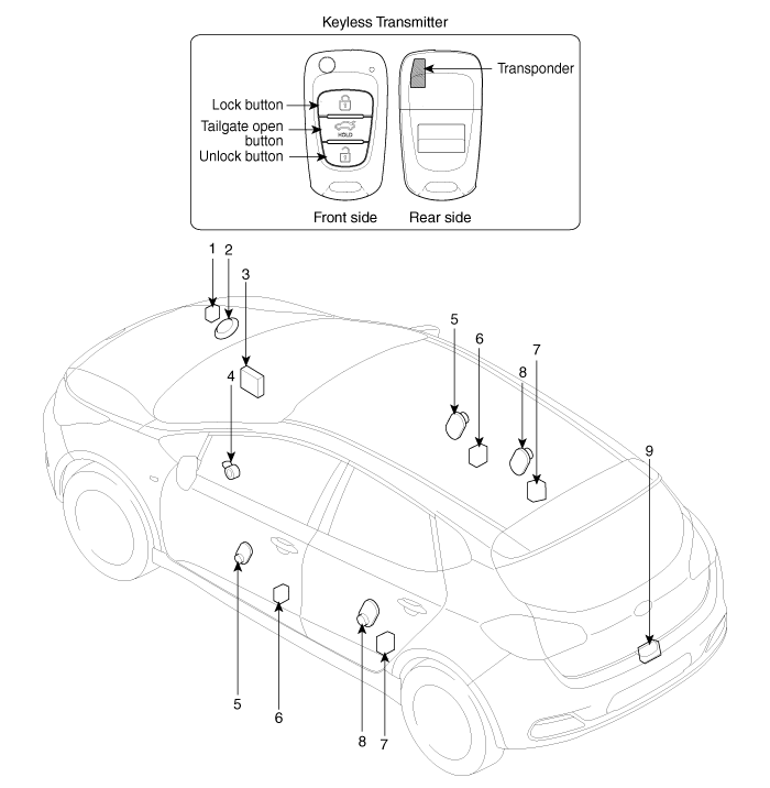 2. Грабительский рог 3. BCM и радиочастотная антенна 4. Ключевой выключатель предупреждения 5. Переключатель передней двери |