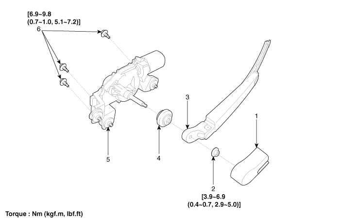 2. Гайка рычага заднего стеклоочистителя 3. Рычаг и щетка заднего стеклоочистителя |