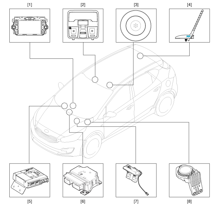 6. Модуль управления дополнительной удерживающей системой (SRSCM) 7. Антенна для аварийного вызова 8. Динамик экстренного вызова |