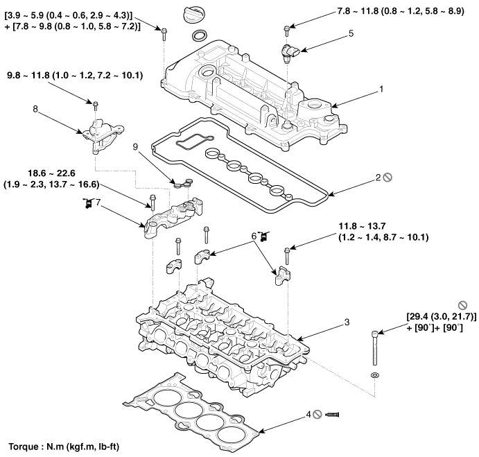 2. Прокладка крышки головки блока цилиндров 3. Головка цилиндра в сборе 4. Прокладка ГБЦ 5. Датчик положения распредвала |